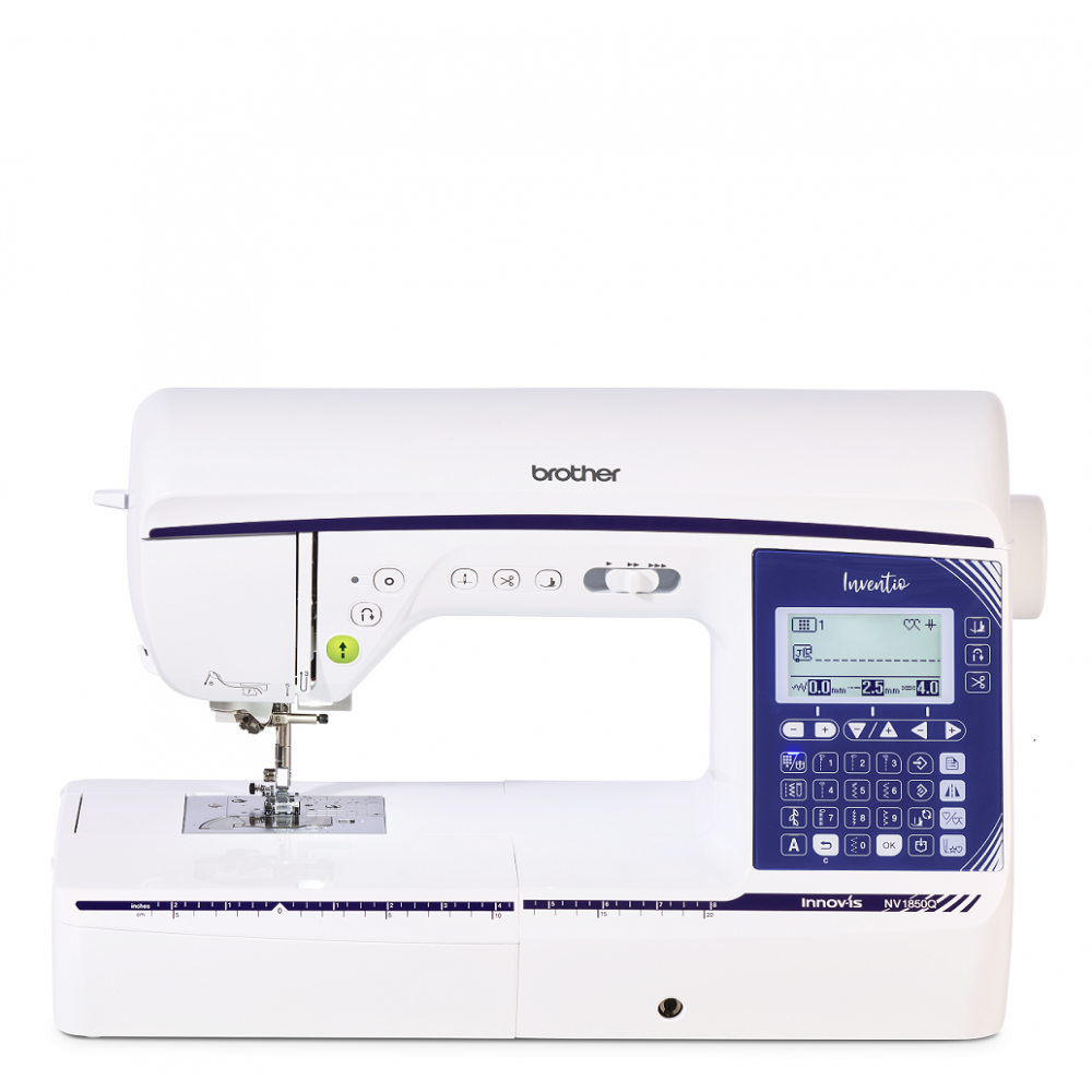 Découvrez la NV1850Q de la série Inventio : machine à coudre et quilting haut de gamme offrant 250 points intégrés, 12 boutonnières automatiques et 6 alphabets. Profitez de son grand espace de 22 cm pour projets volumineux, écran LCD couleur 10 cm, vitesse jusqu’à 900 points/min et éclairage triple LED. Sa connectivité USB, l’entrainement SFDS et la couture multidirectionnelle garantissent créativité, précision et productivité